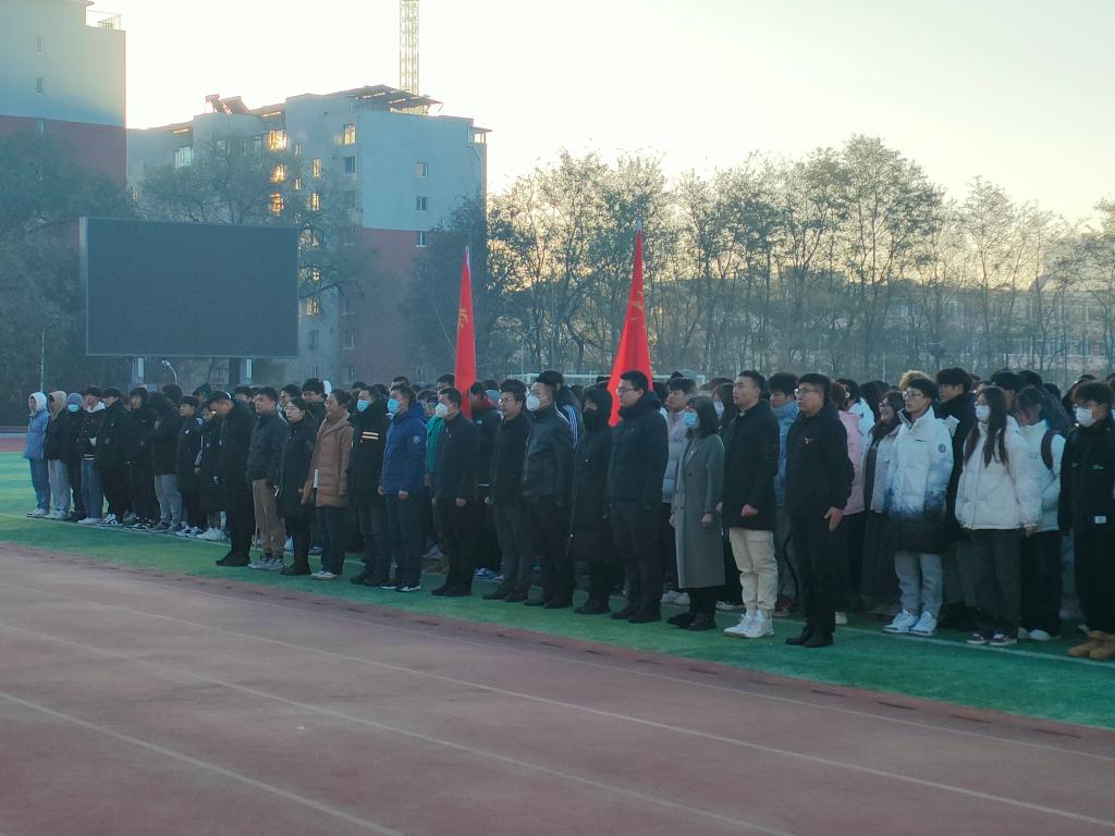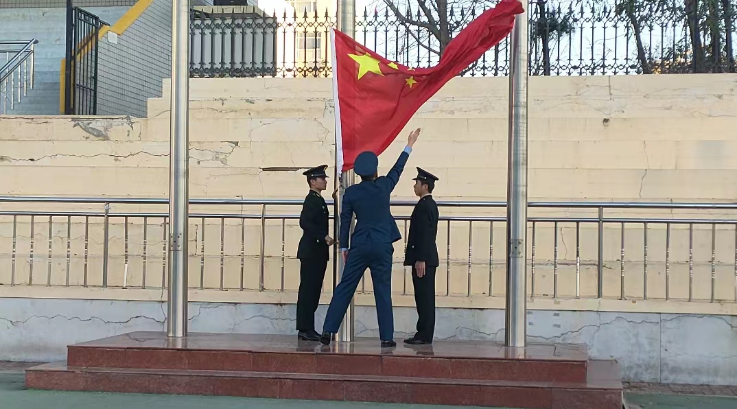 在雄伟的国歌声中,五星红旗缓缓升起,在场师生庄严肃穆,向国旗行注目礼,齐唱国歌,共同祝愿祖国繁荣昌盛。