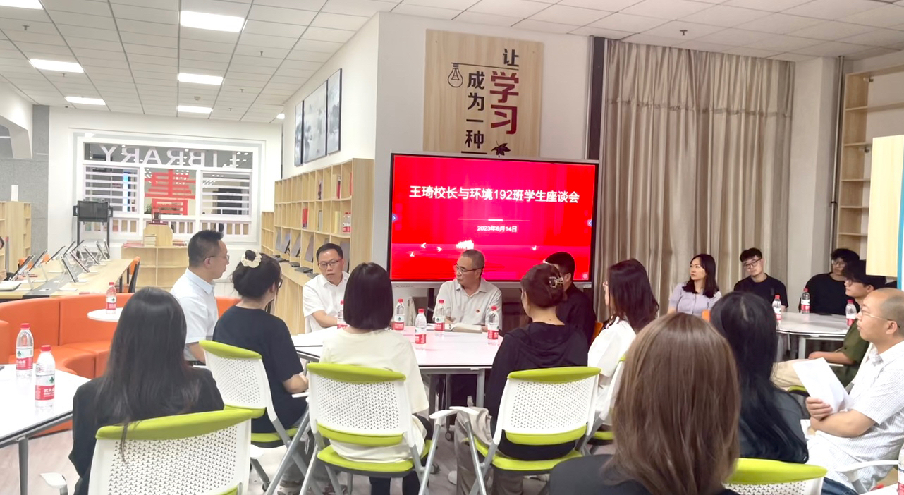 “我也是学环境专业的,我十分关心关注同学们的职业规划与未来发展...”,王琦董事长用亲切的问候和暖心的话语拉进与同学们之间的距离,表达了对环境专业毕业生的殷切期望和诚挚祝福,大家畅所欲言,交流频频,现场气氛温情融洽。针对毕业生们关心的“如何在职场中维持人际关系、尽快完成角色转换”等系列问题,王琦董事长从知识交叉、科学精神、不断学习、整合资源等方面给予了详细耐心逐一地解答。他勉励同学们,要立足新起点,认真领会习近平新时代中国特色社会主义思想,以习近平生态文明思想为指引,注重生态环境与绿色发展。希望大家在今后积极学习、努力进取,谨记母校“砺器悟道”校训精神,不断凝聚奋进力量,实现自我提升与价值实现。