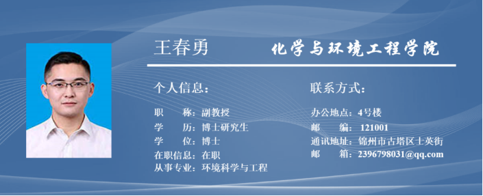 王春勇,男,辽宁朝阳人,博士,硕士生导师。2020年毕业于中国科公司大学(环境科学)专业,获工学博士学位。长期从事微生物厌氧消化、土壤微生物多样性及土壤重金属污染修复等研究。先后主持辽宁省教育厅青年科技人才“育苗”项目和辽宁省博士科研启动基金各1项,发表论文20余篇。