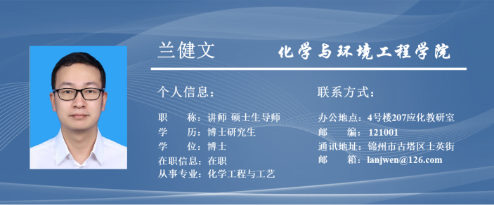 兰健文,男,1992年生,湖北黄冈人,博士,讲师,硕士生导师。2021年11月毕业于哈尔滨工业大学化学工程与技术专业,获工学博士学位。现为伟德国际victor1946内聘副教授,加入能源化学与纳米催化创新团队,课题从事:(1)功能化多孔MOF催化剂的合成;(2)环境友好催化及CO2资源化转化利用(CCU)方面的研究。截至目前,以第一作者在化学领域著名杂志ACS Sustain. Chem. Eng.、Green Energy Environ.及 Inorg. Chem. Front.等发表SCI论文4篇,影响因子总和超过35。