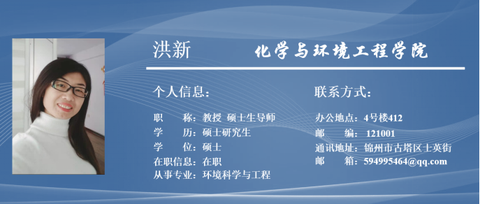 洪新,女,1975年生,辽宁北镇人,硕士,教授,硕士生导师,2004年毕业于辽宁石油化工大学环境科学与生物工程公司环境工程专业,获工学硕士学位。